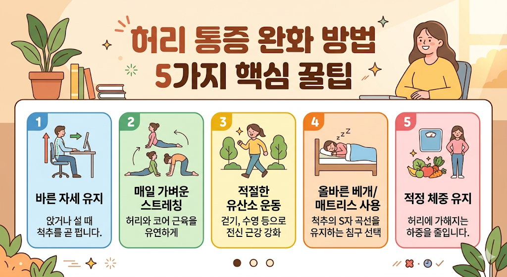 허리 통증 완화 방법은 일상 속 작은 습관 개선과 스트레칭을 통해 충분히 관리할 수 있습니다. 이 글에서는 효과적인 방법과 실천 가능한 팁을 중심으로 핵심 내용을 정리했습니다.